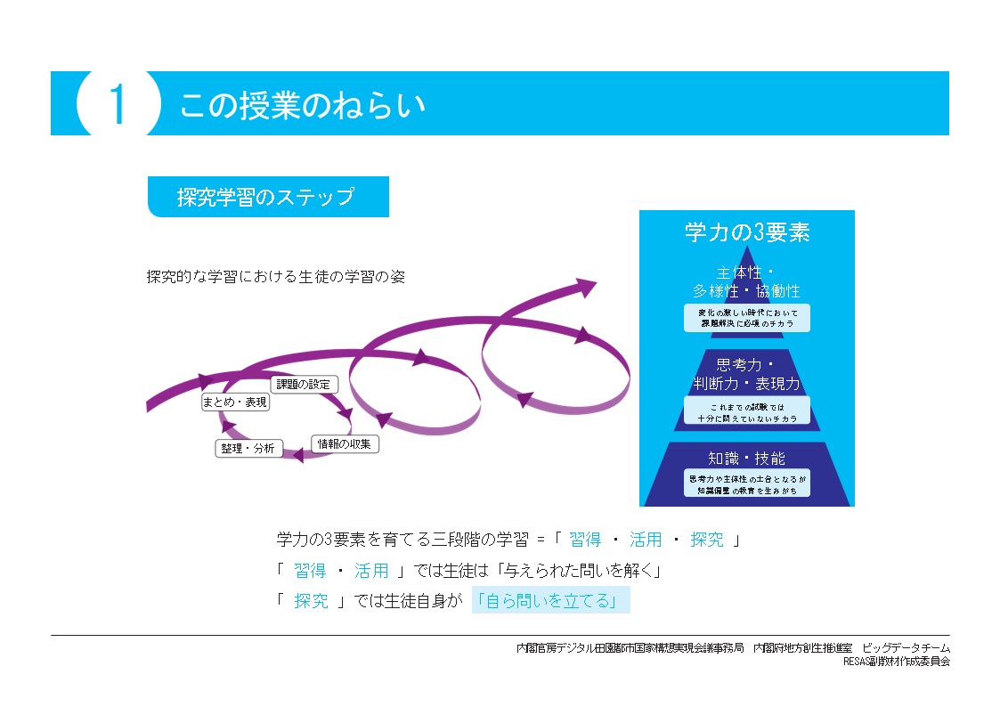 RESASではデータ分析の手法をも学び、また抽出したデータを基に、その他分析ツールを活用しながら地域学習を深めていきます。